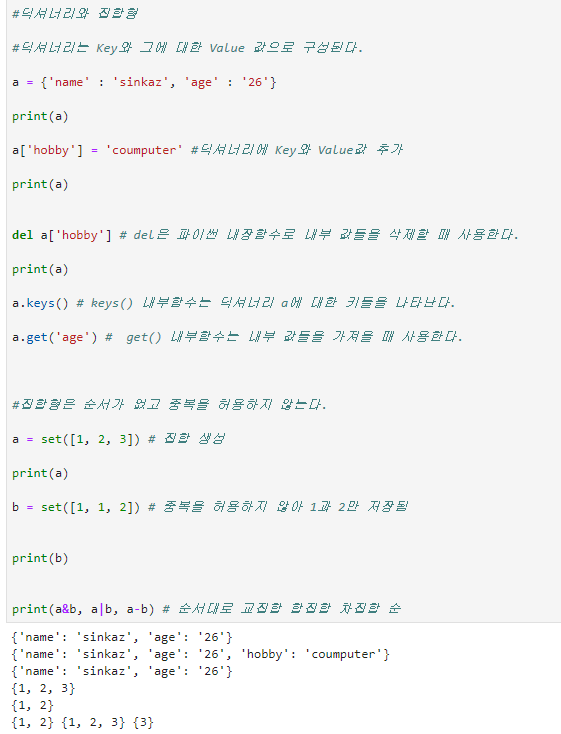 딕셔너리와 집합형입니다. 딕셔너리는 Key : Value 값으로 구성되어 있습니다. 딕셔너리를 생성할 때 {key1 : value1, key2 : value2 ...}으로 선언해줍니다. 따로 key 값을 가져오는 keys() 함수, value 값을 가져오는 get() 함수, 내부 값을 지울때 사용하는 del을 이용합니다.