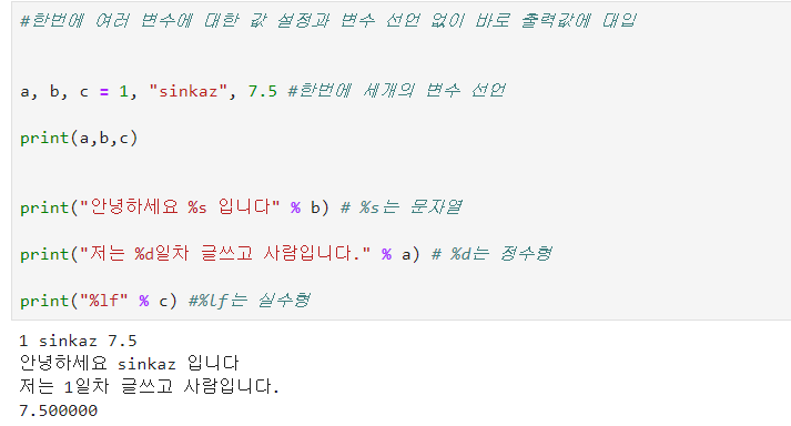 a, b, c = 1, "sinkaz", 7.5 #한번에 세개의 변수 선언