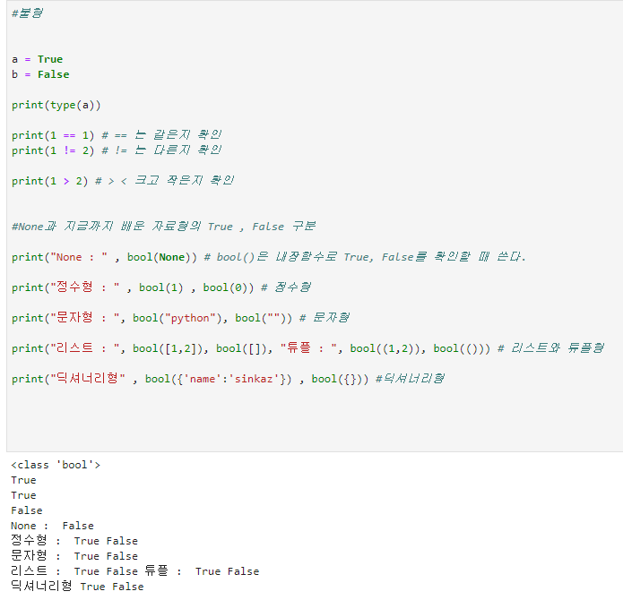 None과 불형입니다. True와 False 두가지만 존재하는 논리 연산으로 이용됩니다. None은 항상 False입니다. ==(같다), =!(다르다) >,<(비교) 사용 가능합니다. bool() 함수는 내장함수로 True, False를 확인하기 위하여 사용됩니다.