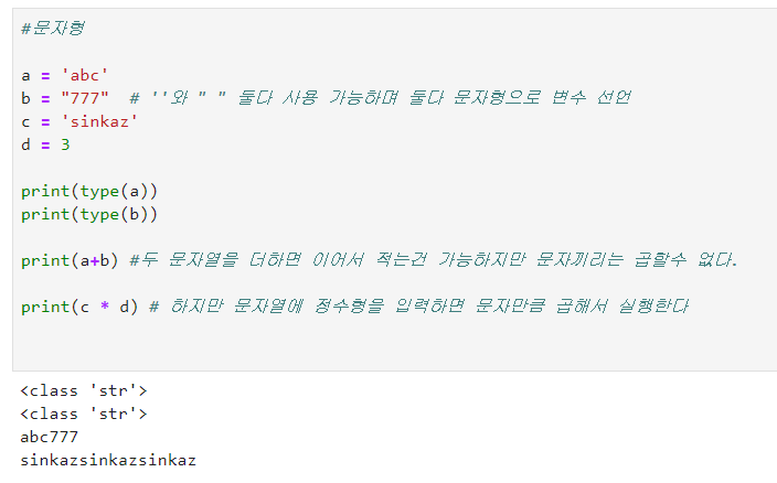 문자형은 ' ' 와 " " 둘다 사용 가능합니다. 타입 출력 결과로 str로 나오는 것은 String 약자이며 문자열을 의미합니다. 다른 언어와는 다르게 문자형에다가 int형을 곱할 수 있는데 문자열의 수만큼 출력됩니다.