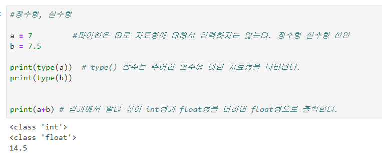처음으로 정수형과 실수형입니다. type() 함수를 이용하여 자료형을 출력하게 되면 int와 float 임을 알 수 있습니다. 또한 int형과 float형을 더해서 출력하면 float형으로 나타내게 됩니다.