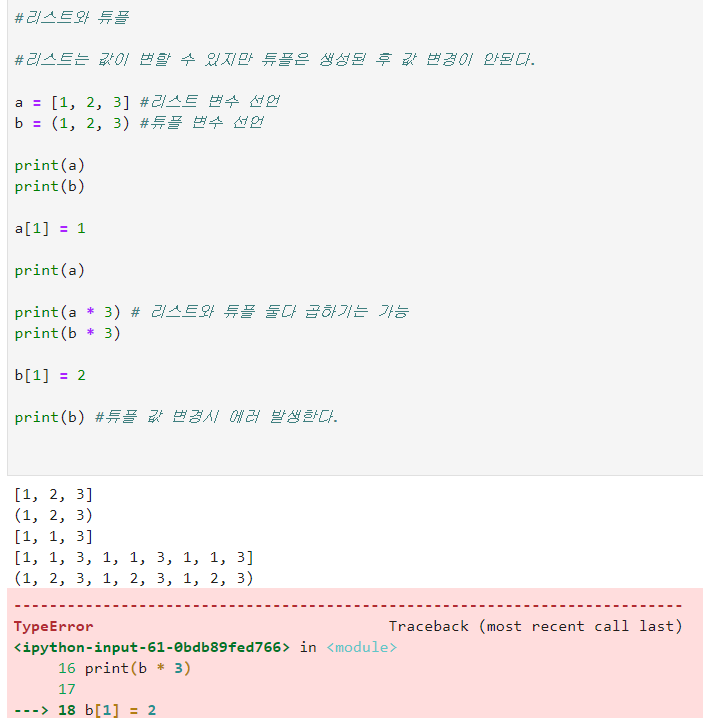 #리스트는 값이 변할 수 있지만 튜플은 생성된 후 값 변경이 안된다.