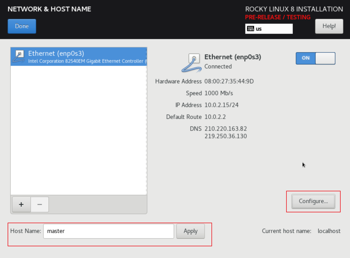네트워크를 설정한다. 먼저 Hostname을 지정한 후 이더넷 설정의 Configure을 클릭하여 IP를 설정한다.