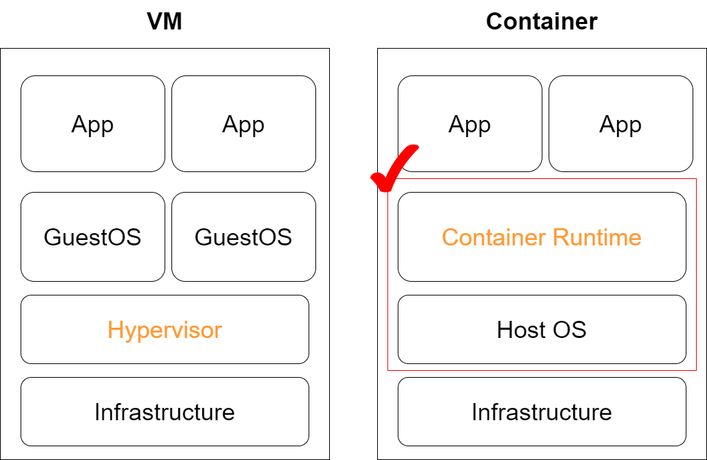OS 위에 Container Runtime만 설치해서 App을 배포하는 것과 어떤게 더 가볍고 빠를가요?