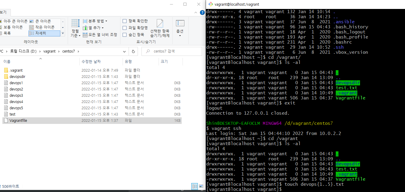 해당 VM 내 /vagrant에서 파일 생성해도 Windows에서도 확인 가능함