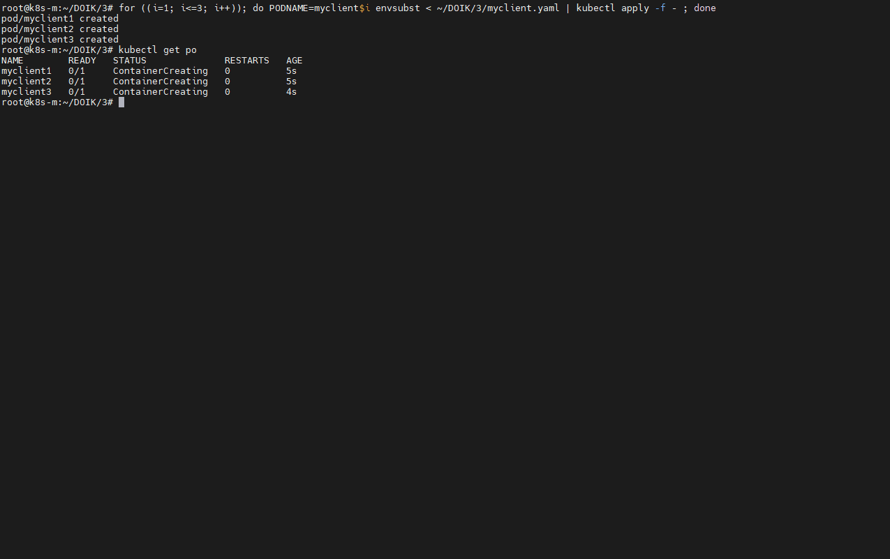 for ((i=1; i<=3; i++)); do PODNAME=myclient$i envsubst < ~/DOIK/3/myclient.yaml | kubectl apply -f - ; done