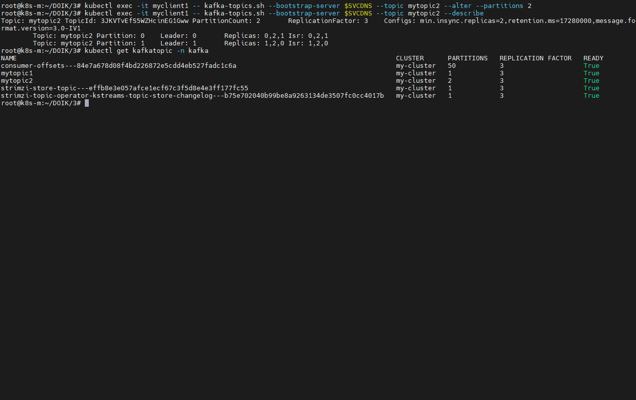 kubectl exec -it myclient1 -- kafka-topics.sh --bootstrap-server $SVCDNS --topic mytopic2 --alter --partitions 2