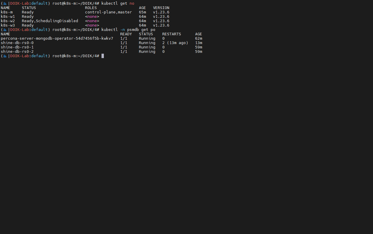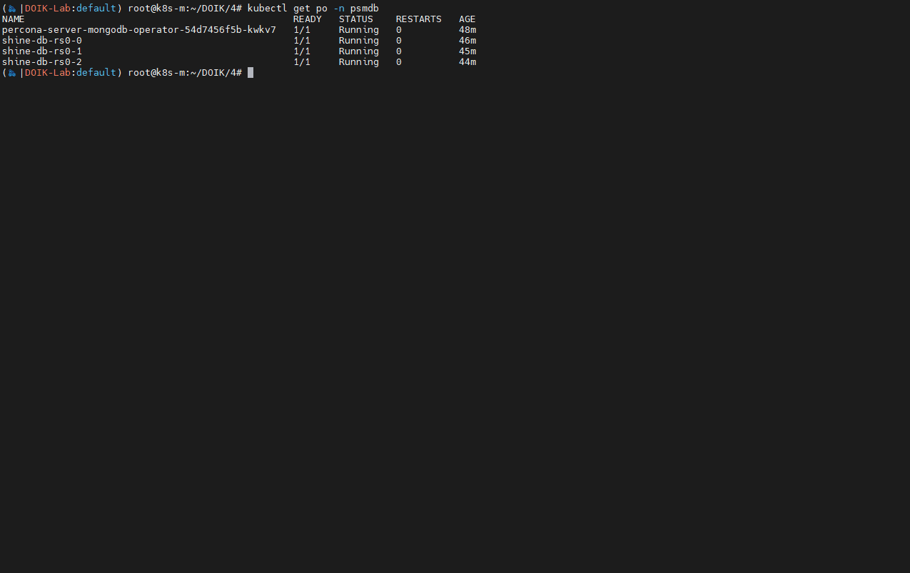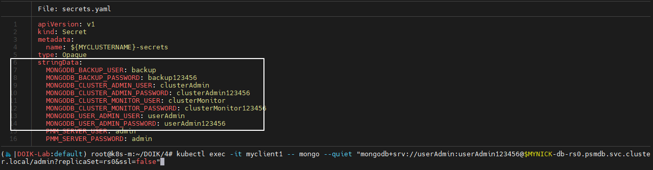 kubectl exec -it myclient1 -- mongo --quiet "mongodb+srv://userAdmin:userAdmin123456**@$MYNICK-db-rs0.psmdb.svc.cluster.local/**admin**?replicaSet=rs0&ssl=false"