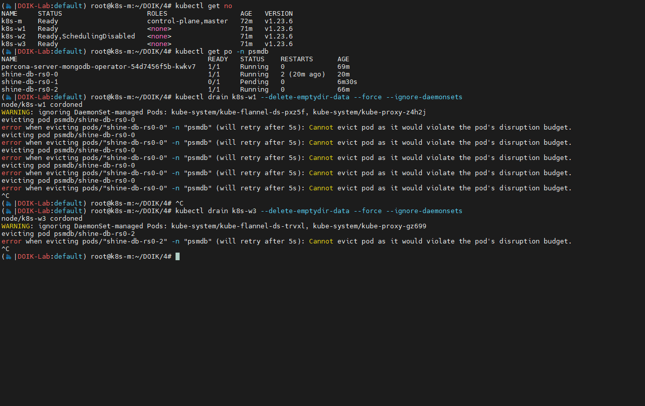 - 두번째 노드 Drain 시 -> PodDisruptionBudget 제약을 받음