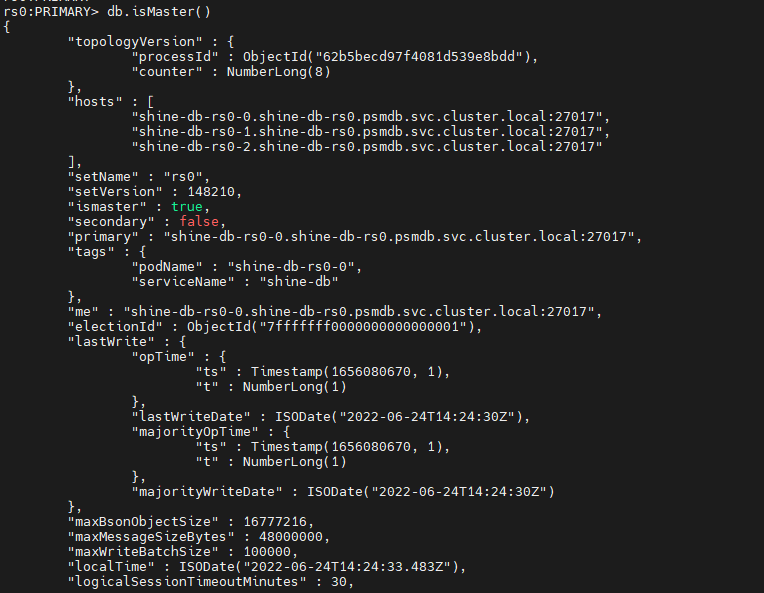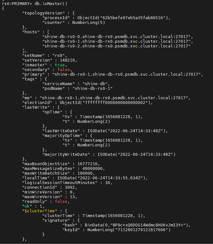 kubectl exec -it myclient1 -- mongo --quiet "mongodb+srv://userAdmin:userAdmin123456@$MYNICK-db-rs0.psmdb.svc.cluster.local/admin?replicaSet=rs0&ssl=false"