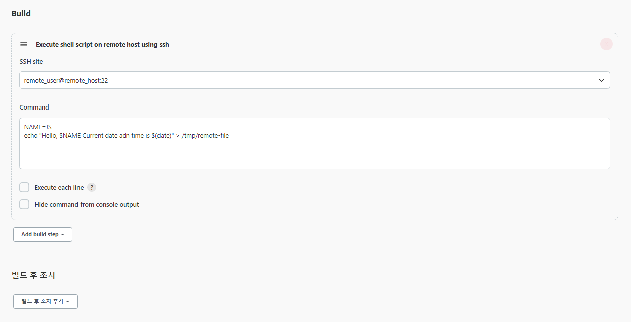 - Remote Job - Build 실행 부분에 Command Remote Host 설정